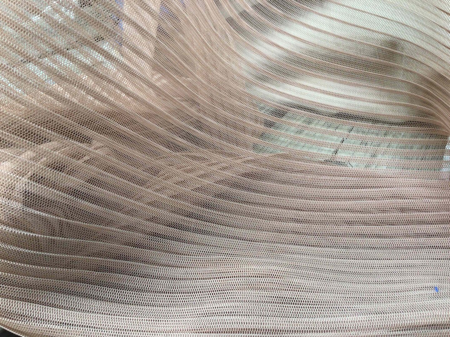 Tessuto tipo tulle, plissettato, colore rosa antico. Campione dimostrativo 10 cm. x 10 cm. Disponibilità immediata in magazzino.