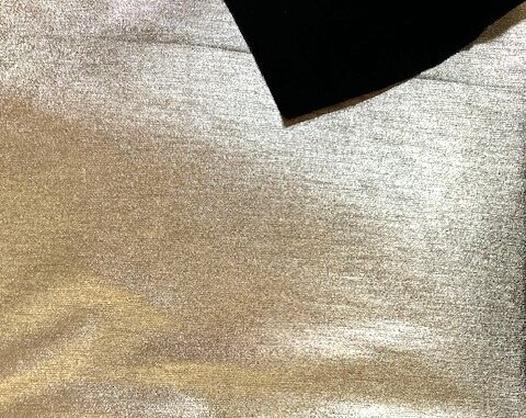 Tessuto jersey in poliestere lycra placato oro per costumi da bagno o abiti. Campione dimostrativo 10 cm. x 10 cm.